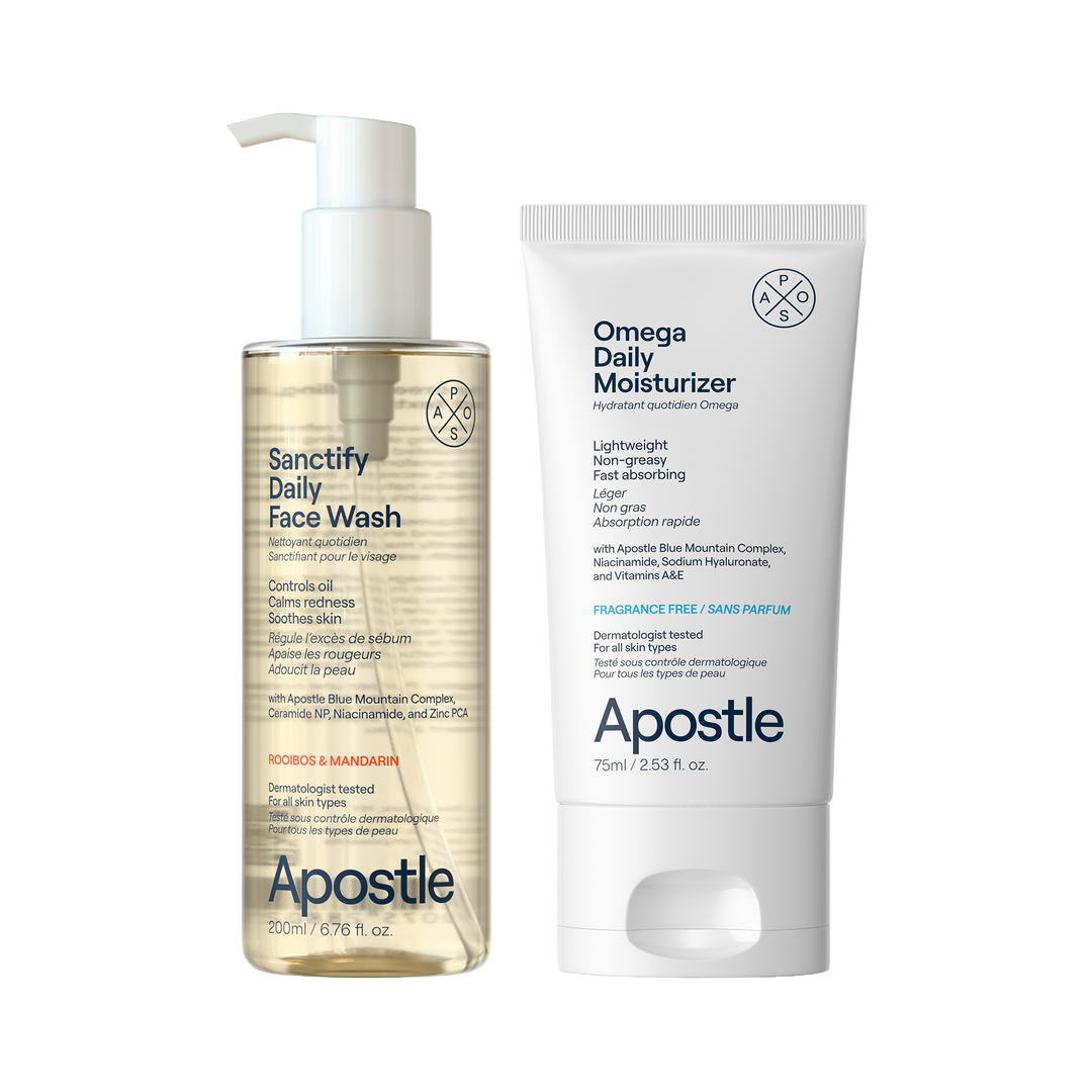 Refresh. Restore. Repeat. This two-step bundle pairs our Sanctify Daily Face Wash with the hydrating Omega Daily Moisturizer. Cleanse with Niacinamide and Ceramide, then hydrate with Hyaluronic Acid and Vitamin C to combat daily stressors. Two steps for clean skin and daily confidence.