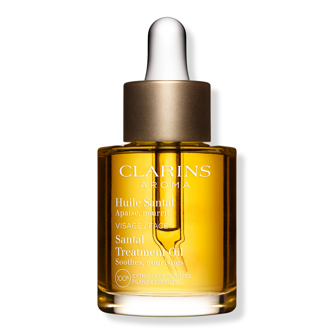 Clarins' Santal Soothing & Hydrating Face Treatment Oil is a soothing face treatment oil formulated with 100% natural plant extracts to comfort, soften, and calm dry skin.