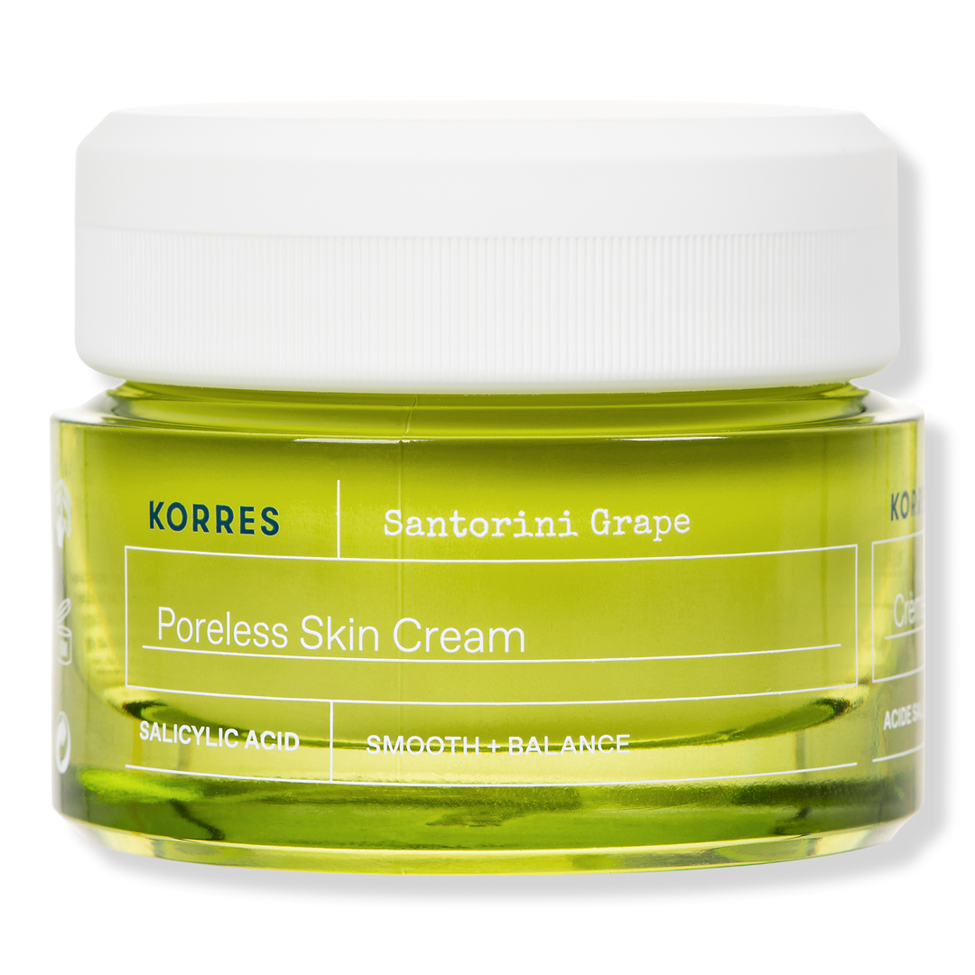 Korres Santorini Grape Poreless Skin Cream is a lightweight gel moisturizer that blurs pores, controls shine, and hydrates skin all-day using a powerful blend of Hyaluronic Acid, Salicylic Acid, Willowherb Extract, and the antioxidant-rich, Santorini Grape.