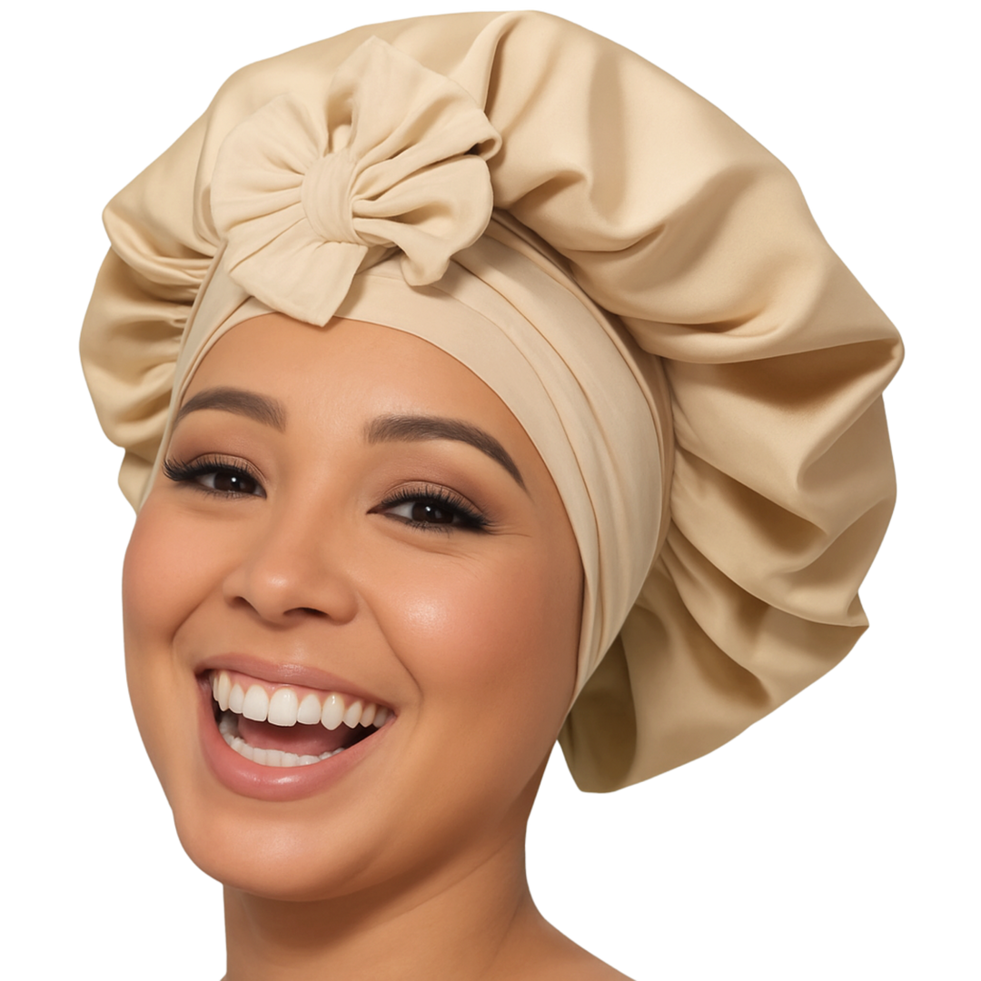 - The elegant, oversized design features a stylish bow, adding a touch of sophistication to your nighttime routine. Not just a bonnet, it's a must-have accessory that combines high-quality craftsmanship with practical functionality to keep your hair looking its best.
