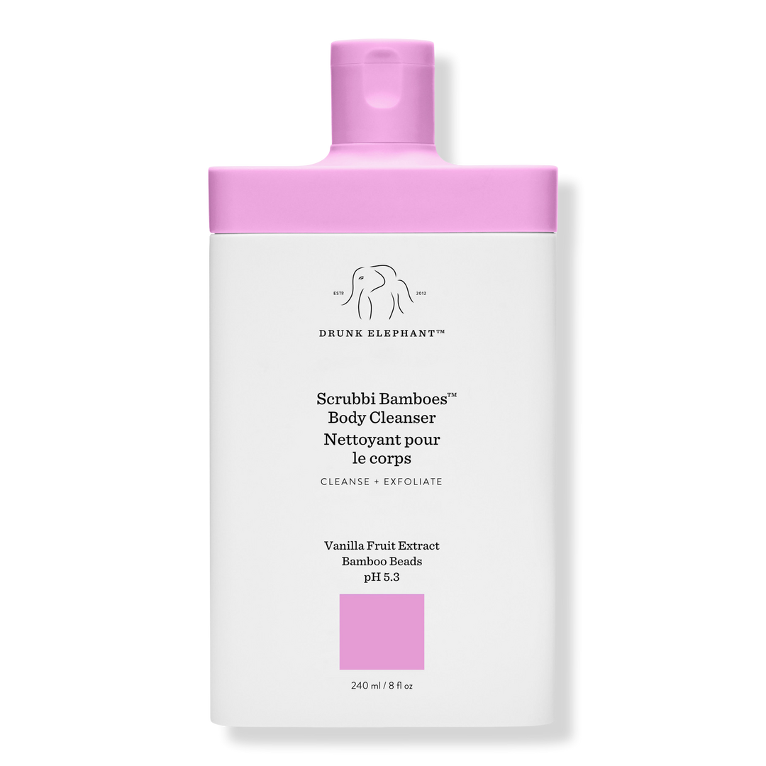 Drunk Elephant's Scrubbi Bamboes Body Cleanser is an exfoliating, antioxidant-rich jelly-to-foam body cleanser that thoroughly cleanses, softens, hydrates, and soothes with a mild, naturally sweet vanilla scent.