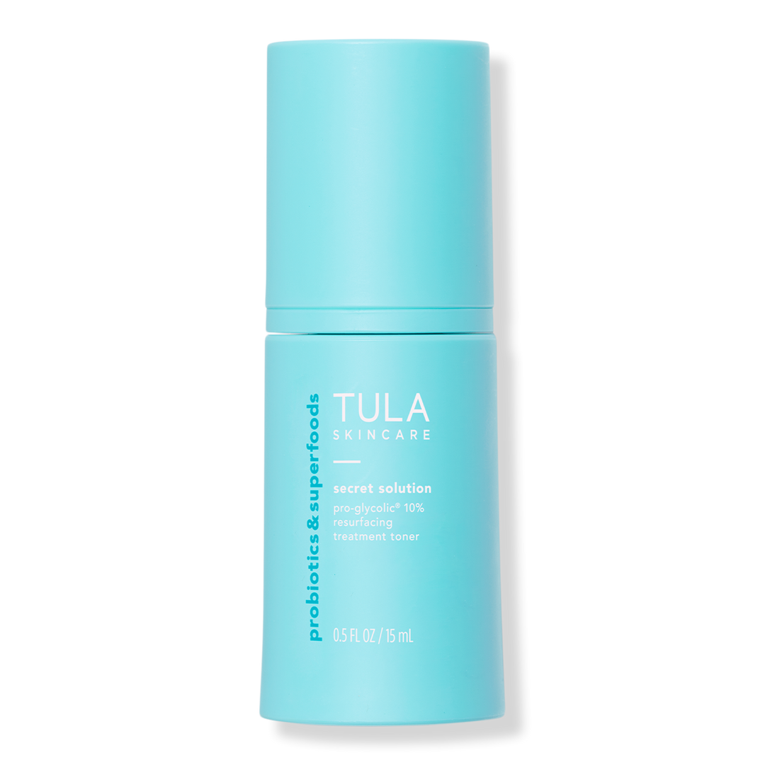 TULA’s Secret Solution Pro-Glycolic 10% Resurfacing Treatment Toner features a blend of probiotic extracts & glycolic acid to powerfully, yet gently exfoliate. Helping your skincare absorb better & leaves your skin looking smooth & even.