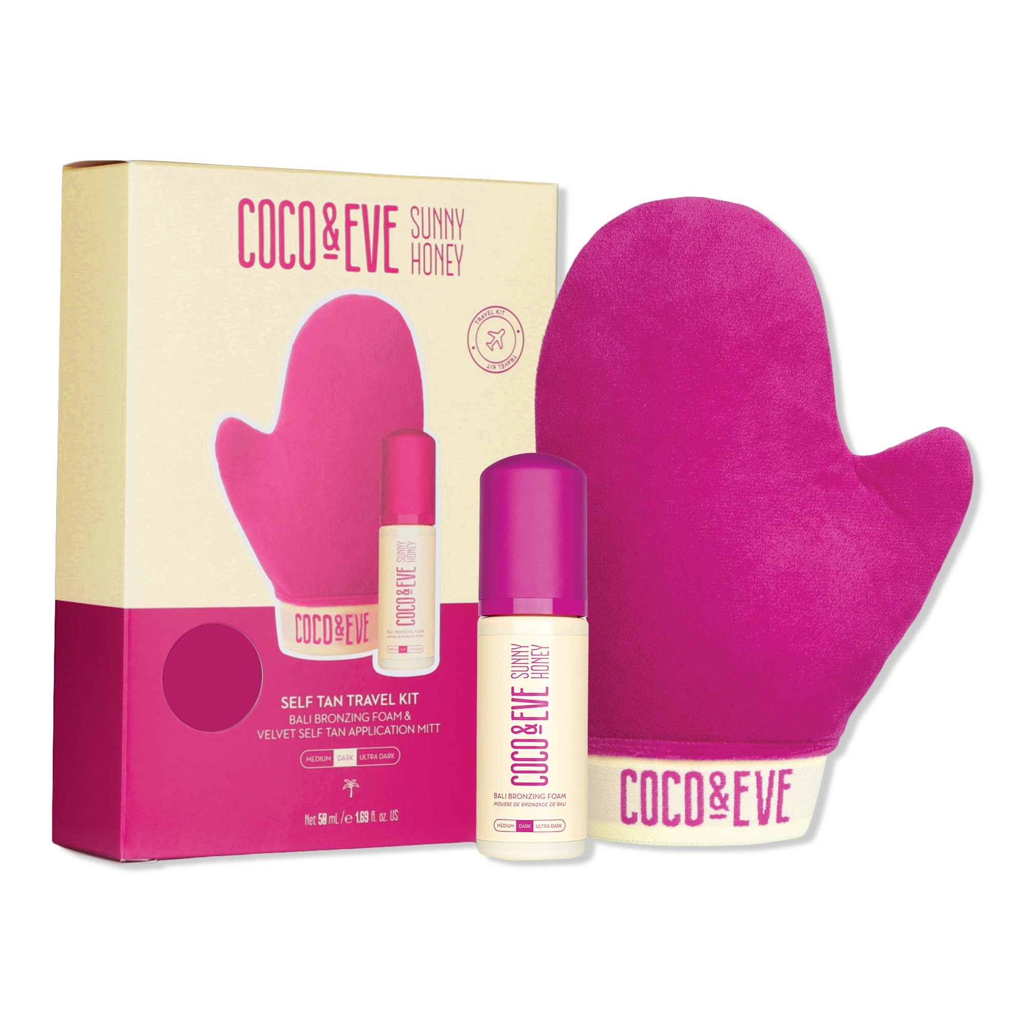 Take Coco & Eve's bestselling Bali Bronzing Foam and Velvet Application Mitt on all your trips with this Self Tan Travel Kit!