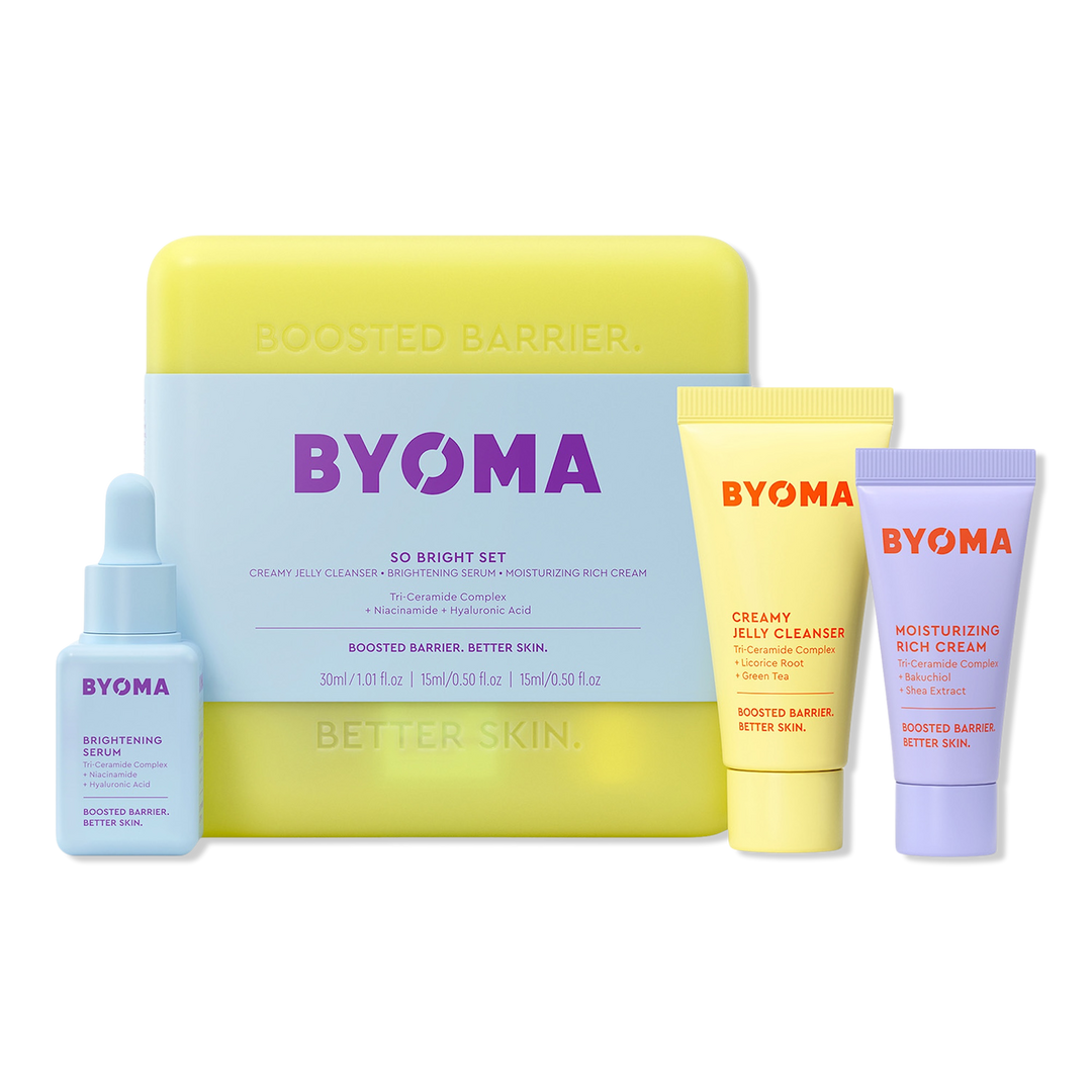 Boost dull skin with BYOMA's So Bright Set of dermatologist-approved essentials for a bouncy, glowing complexion! Featuring Brightening Serum, an antioxidant-rich treatment that improves skin tone + texture.