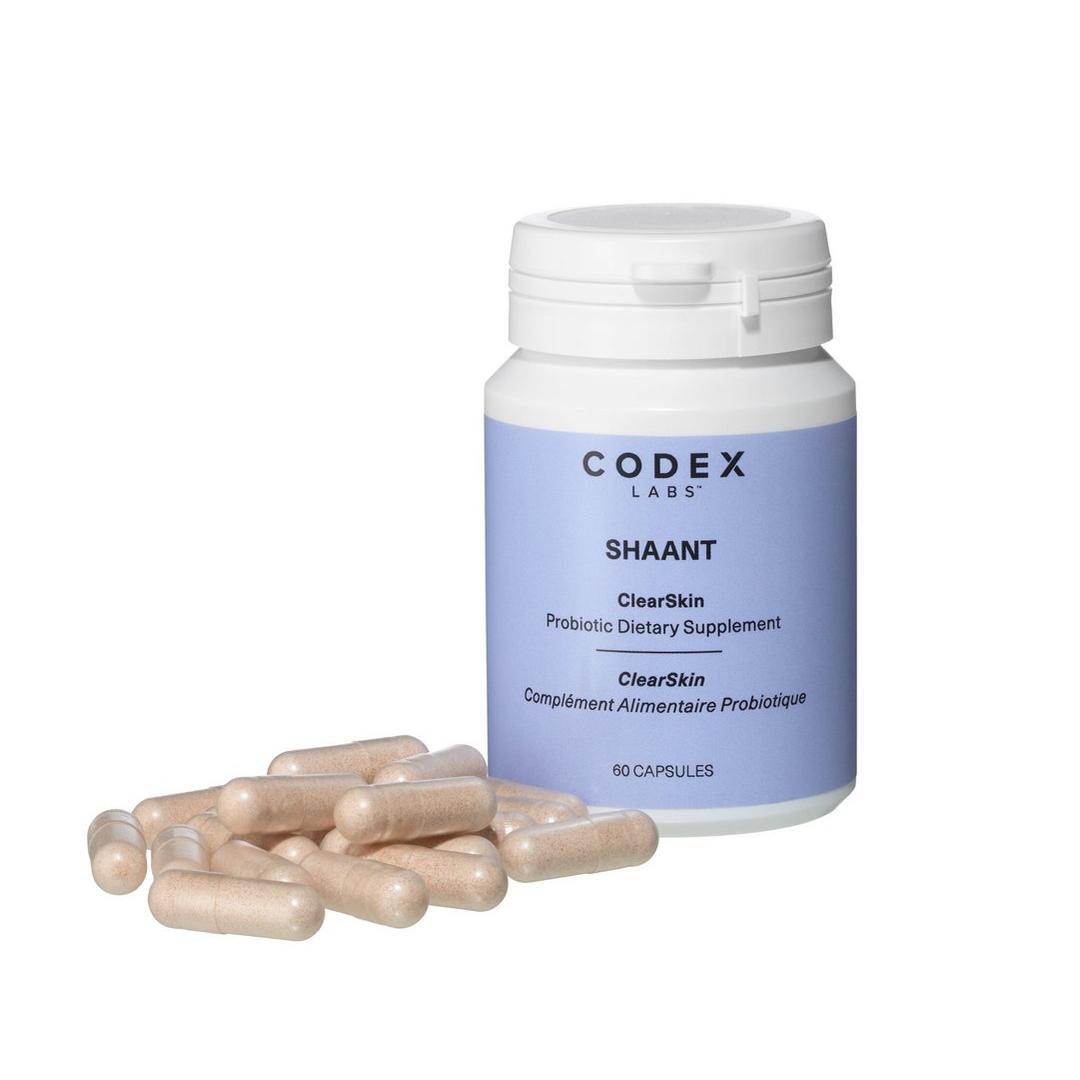 Shaant ClearSkin probiotic supplement is designed to support both a healthy gut and skin microbiome, as well as reduce sebum production by addressing lipid levels and address insulin resistance. For acne-prone skin.