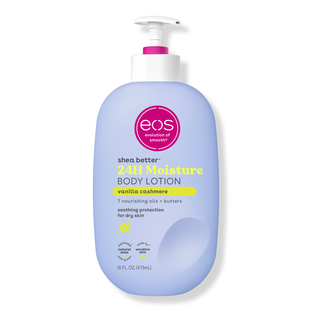 Eos Shea Better 24HR Moisture Body Lotion with instantly moisturizing Shea Oil + lasting protection Shea Butter quickly absorbs for 24-hour hydration. Say hello to… fast-absorption, lightweight, soft skin, and sustainable shea. Say goodbye to… greasiness, heaviness, and sticky residue.