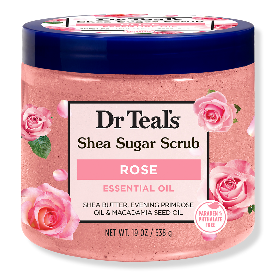 Dr Teal's Shea Sugar Body Scrub is formulated with Shea Butter, Sugar, and Essential Oils to exfoliate and smooth skin. Rose essential oil helps calm the mind, while shea butter, evening primrose oil, and macadamia seed oil leave the skin moisturized.