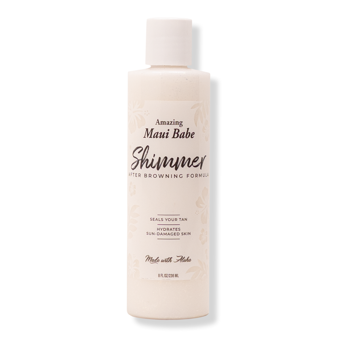 Maui Babe Shimmer After Sun Formula will keep your skin glowing with its light diffusing micro-flecks while the Macadamia Nut Oil and glycerin will lock in hydration and extend the length of your tan.