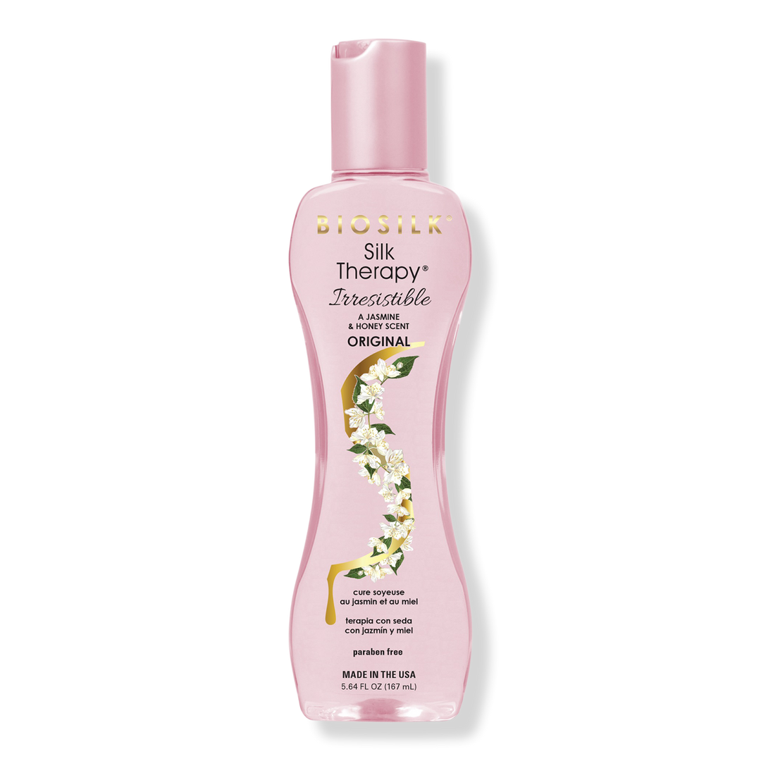 The original weightless leave in silk is now in the luscious fragrance of jasmine and honeyed spice. BioSilk Silk Therapy Irresistible is a reconstructing treatment that repairs, smooths and protects all hair types