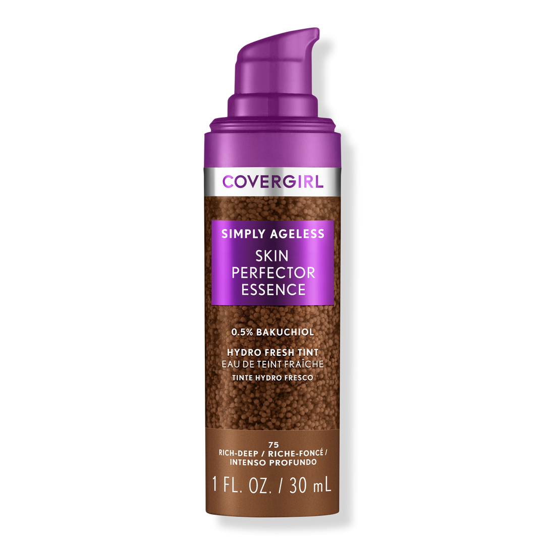 CoverGirl Simply Ageless Skin Perfector Essence, a skincare + makeup hybrid with microdroplet technology, gives your complexion a radiant bare-skin filter effect. A liquid foundation with pigmented capsules burst and blend easily to distribute a sheer, even tint that makes skin look plump.