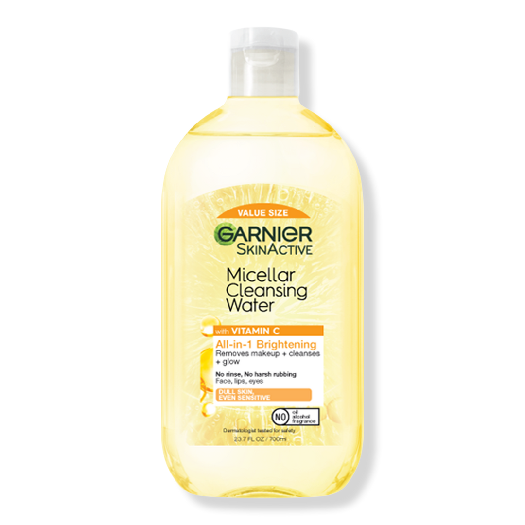 Garnier SkinActive Micellar Cleansing Water, with Vitamin C cleanses skin, removes makeup, and boosts glow in 1 step.