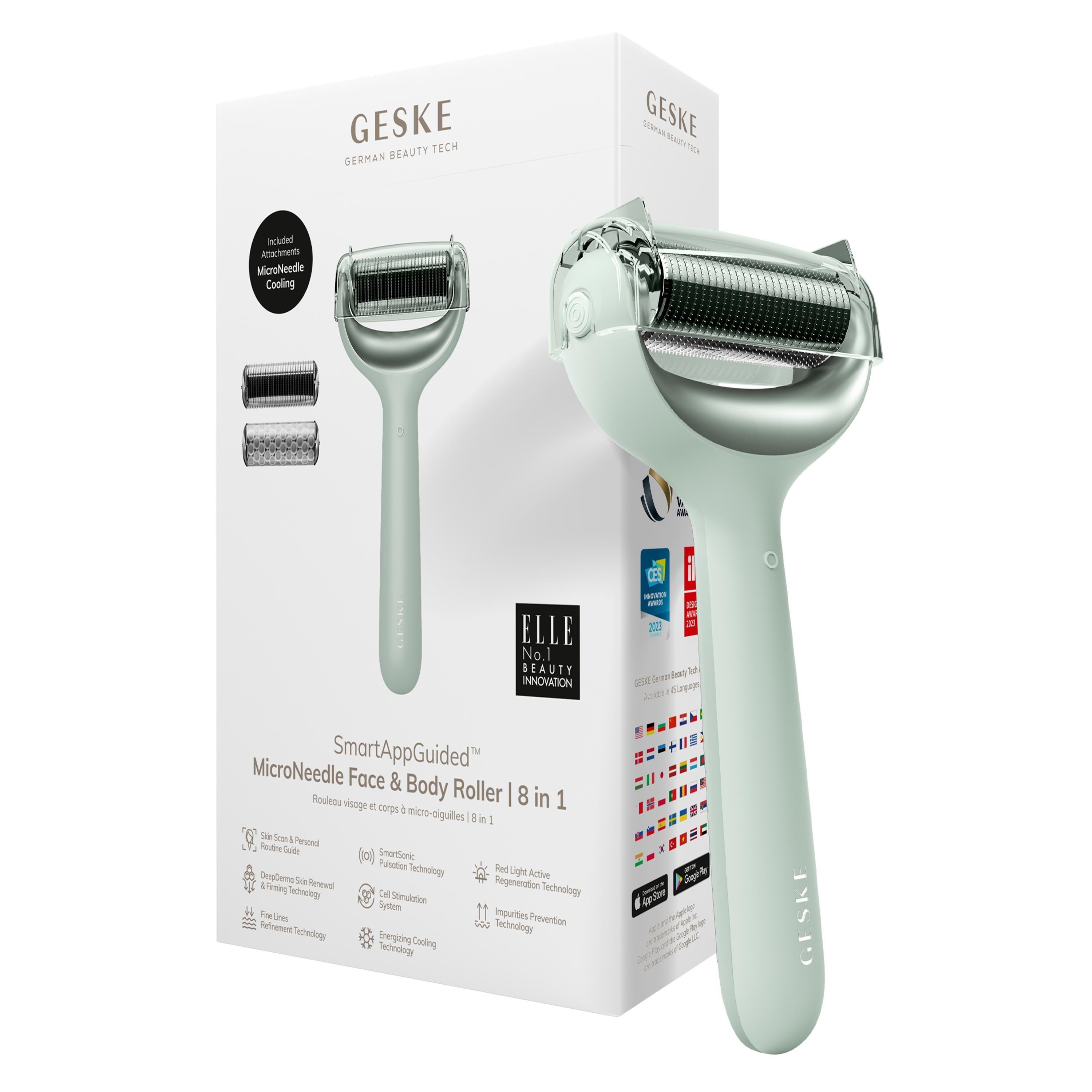 Stimulate your skin with the GESKE SmartAppGuided MicroNeedle Face & Body Roller 8 in 1. This innovative beauty device comes with a MicroNeedle and a Cooling head.
