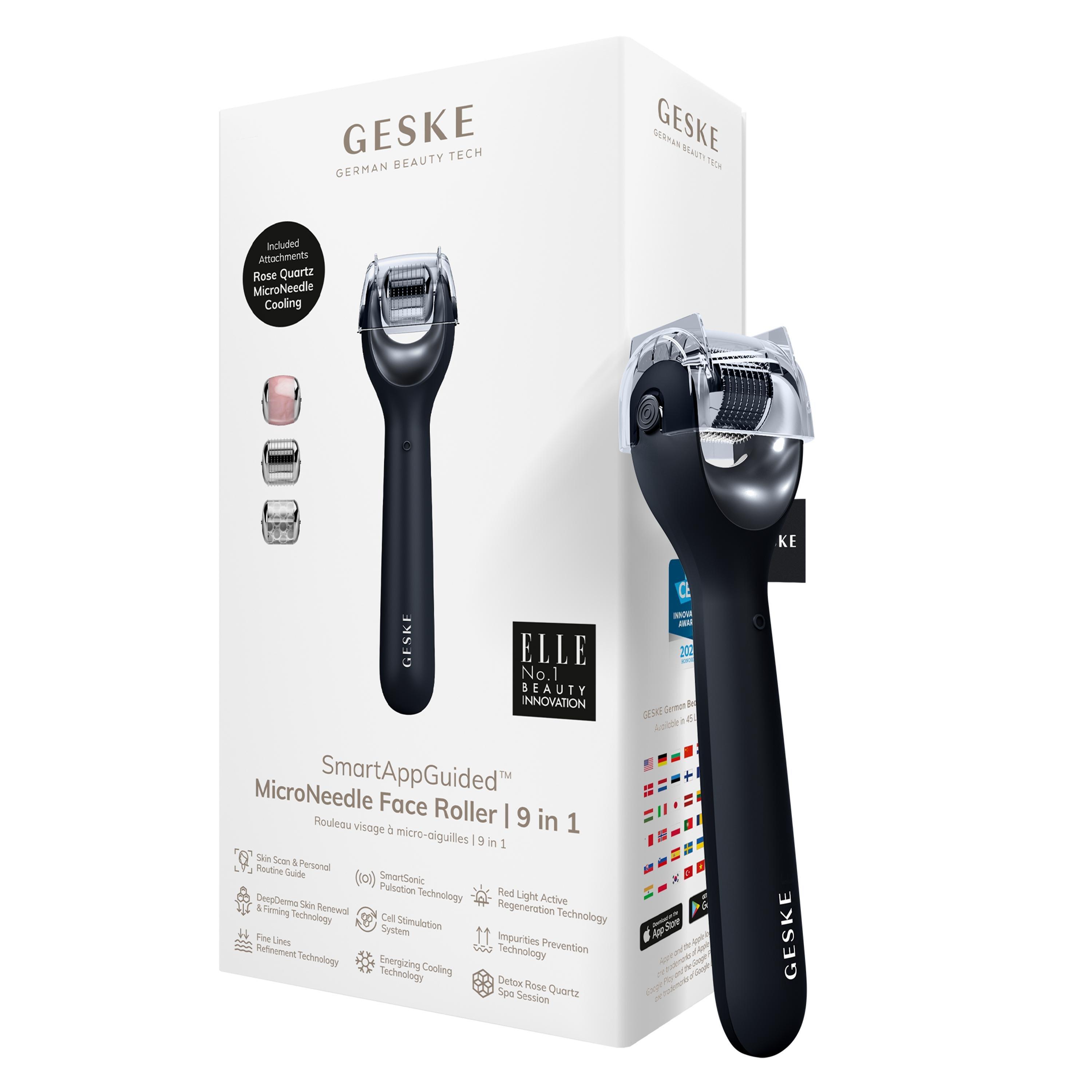 Stimulate your skin with the GESKE SmartAppGuided MicroNeedle Face Roller 9 in 1. This innovative beauty device comes with a MicroNeedle, a Cooling and a Rose Quartz head.