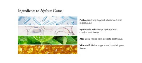 - Hyaluronic acid: A hydrating powerhouse that moisturizes and calms gums.