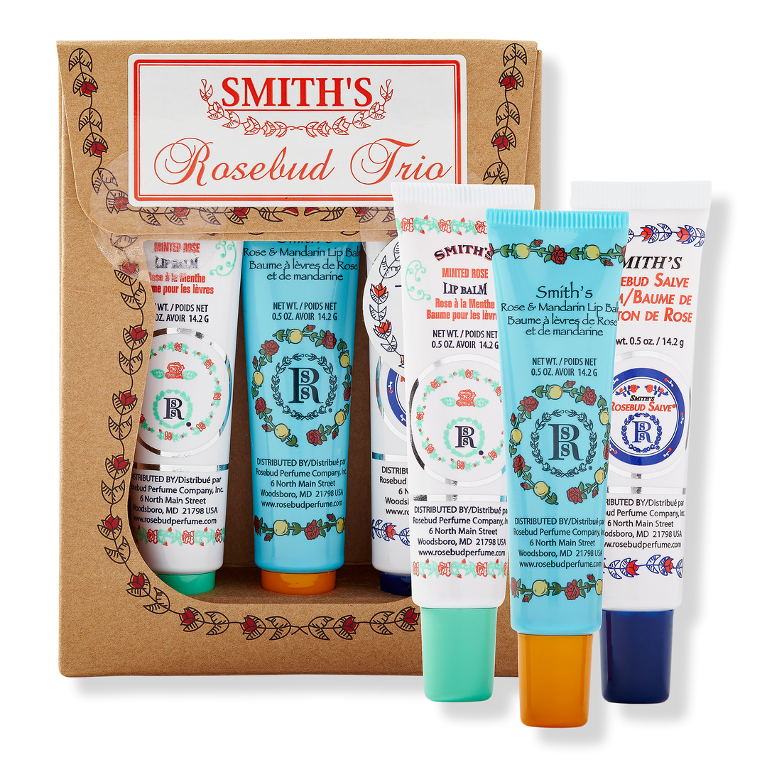 This Lip Balm Trio by Rosebud Perfume Co. features Rosebud Salve, Minted Rose Lip Balm, Rose & Mandarin Lip Balm Tubes.