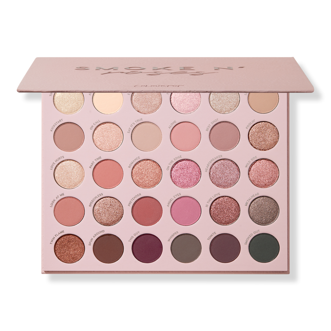 ColourPop's Smoke N' Roses Pressed Powder Palette features a sultry mix of 30 rosy and smokey hues in creamy matte and shimmering metallic finishes.