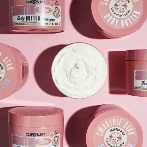Want silky, sexy, famously soft skin? Rub elbows - and legs, arms, shoulders, knees, and feet with Soap & Glory's Smoothie Star Body Buttercream. This luxurious, lightly-whipped, super nourishing 5-oil body buttercream features pistachio, almond and coconut oil, shea butter, and cocoa butter.