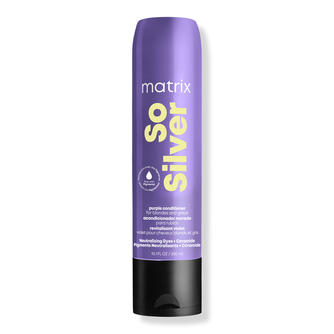 Toning and care in just one wash! Matrix So Silver Purple Conditioner, infused with purple pigments and ceramide, helps remove brassy undertones in just one wash! Provides 2x more moisture and shiny, stronger hair. For blondes and greys.