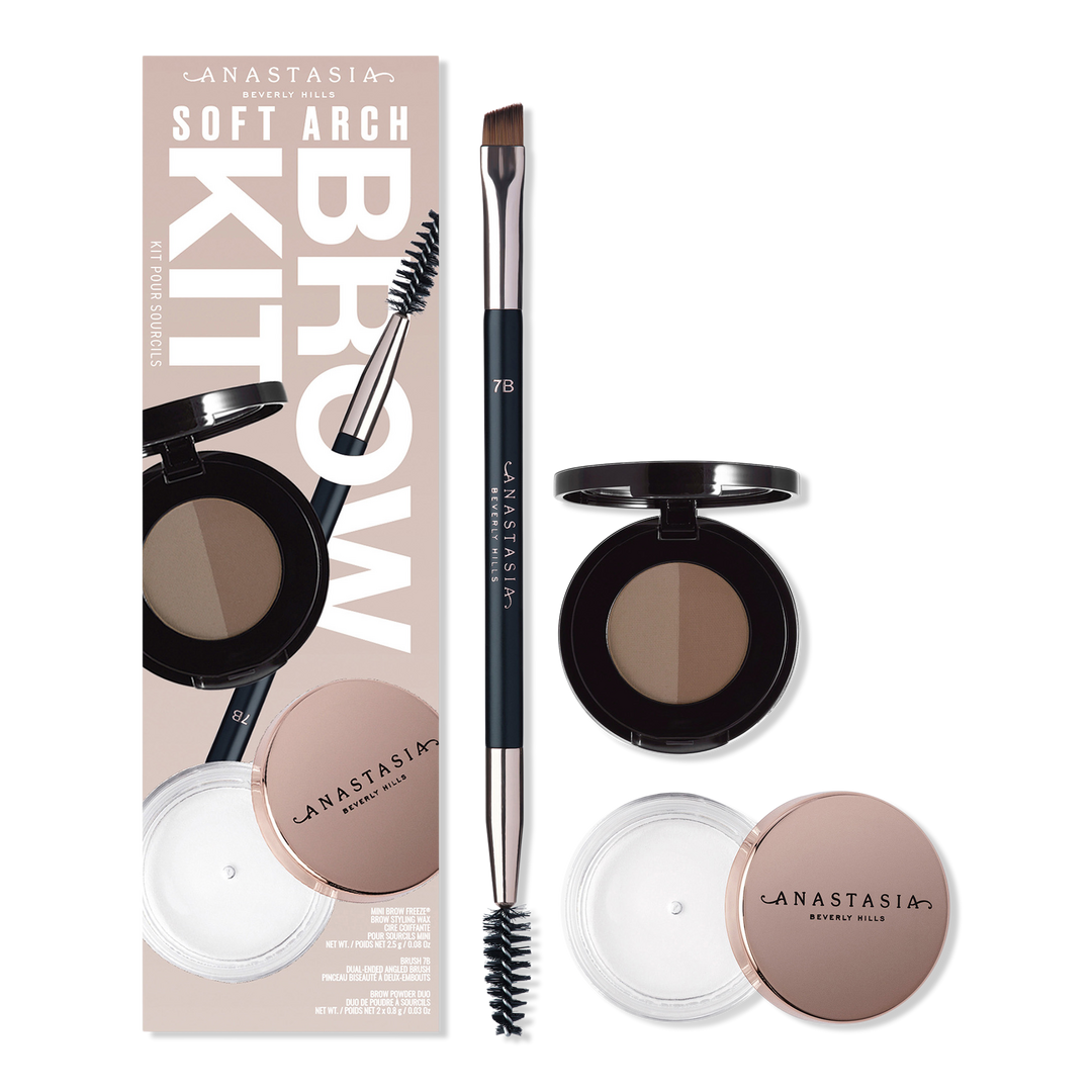 Anastasia Beverly Hills Mini Brow Freeze® Styling Wax, Brush 7B Dual-Ended Angled Brush, and Brow Powder Duo are the ultimate brow essentials for long-lasting feathered brows.
