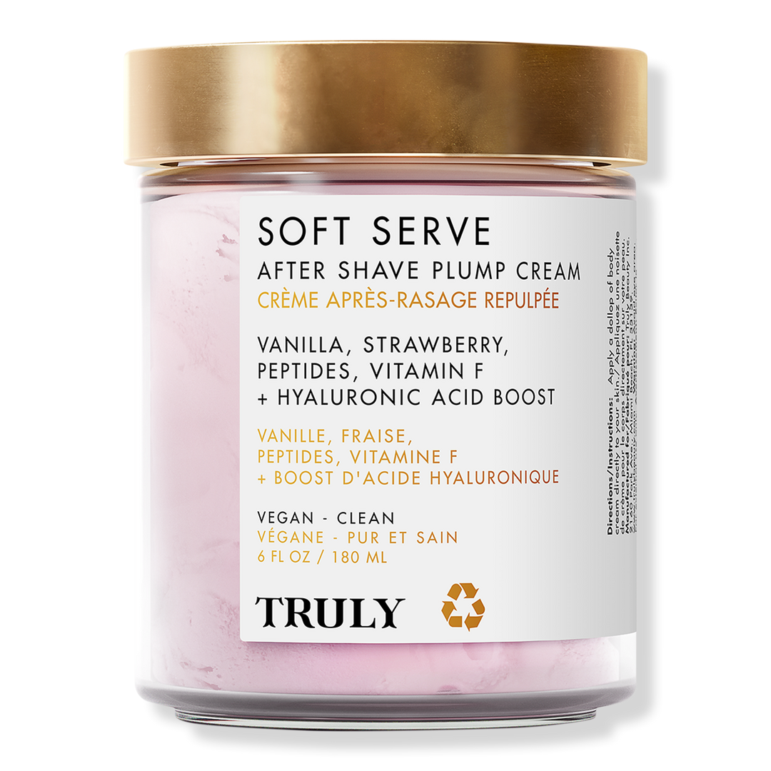 Truly’s Soft Serve After Shave Plump Cream is an ultra rich body cream that visibly plumps and hydrates while fighting ingrown hairs for silky smooth, youthful looking skin. Enriched with strawberry, hyaluronic acid, and peptides to combat dryness, signs of aging, and textured skin.