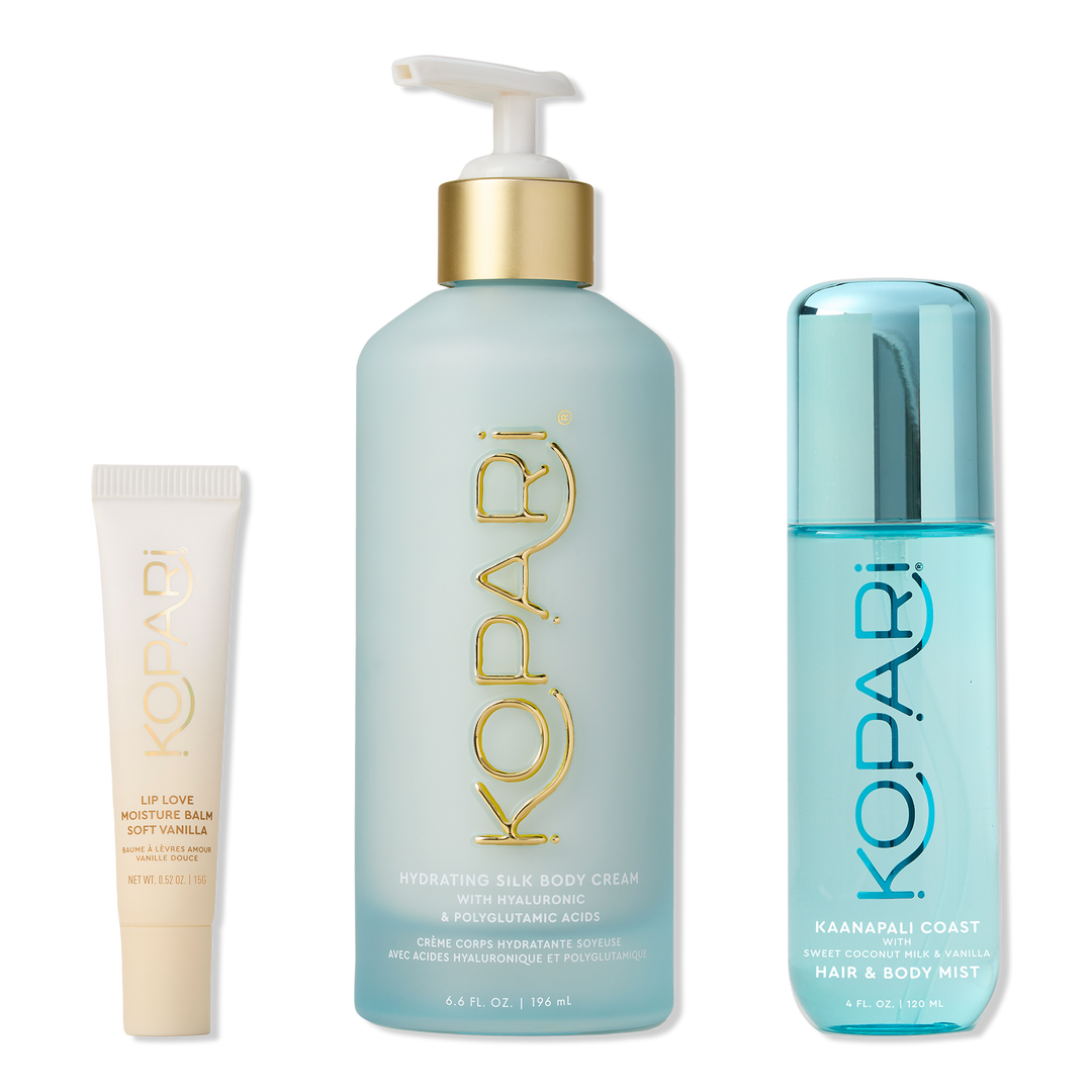 Wrap yourself in softness with Kopari’s Soft & Silky Body & Lip Kit - featuring a hydrating body cream, creamy coconut Kaanapali Coast Hair & Body Mist, and nourishing Lip Love Balm in Soft Vanilla for smooth skin, a sweet scent, and soft lips.