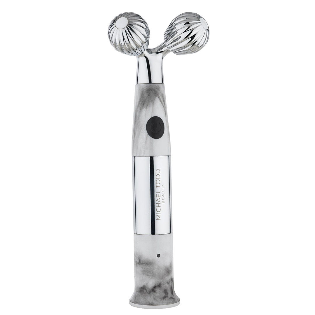 The world's first sonic face and body contouring roller with interchangeable stainless steel and obsidian globes. Lifts, firms, and boosts collagen production — use cold, warm, or at room temperature.