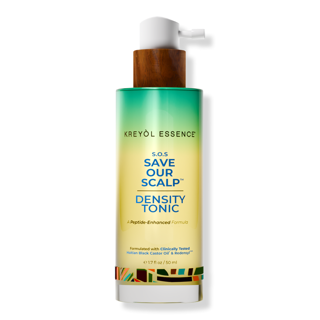 Kreyòl Essence Bi-Phase Density Spray boosts hair for a thicker fuller look with Growth Complex Haitian Black Castor Oil and Redensyl. Keratin adds shine caffeine reduces frizz and hemisqualane offers a sustainable silicone alternative for smooth healthy-looking hair.