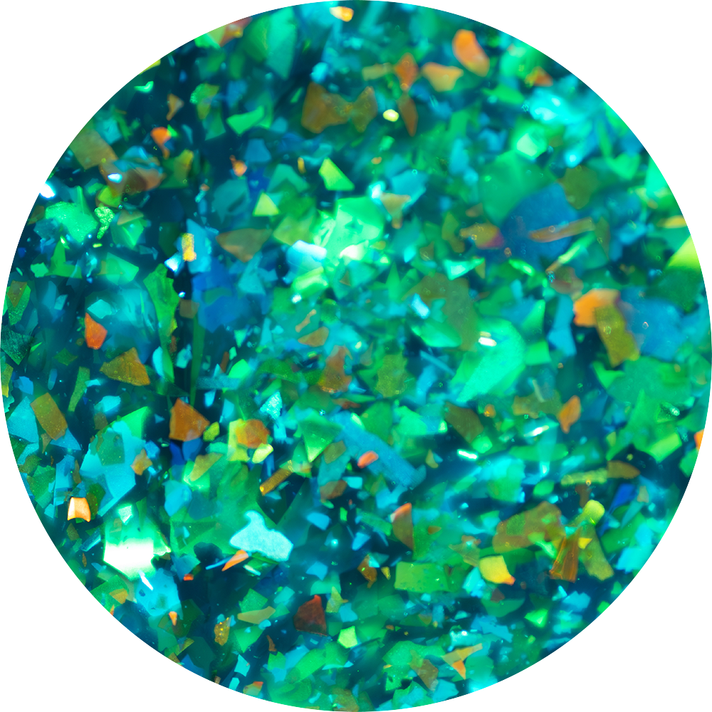 - Iridescent flakies in a teal aqua jelly base.