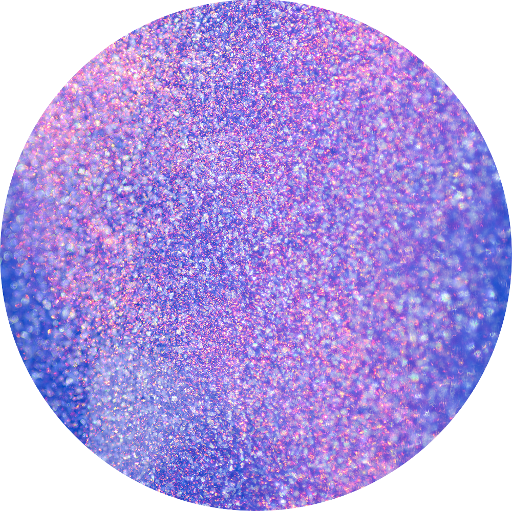 - Crushed holographic formula in a blue-violet shade with pink iridescent micro-shimmer underglow