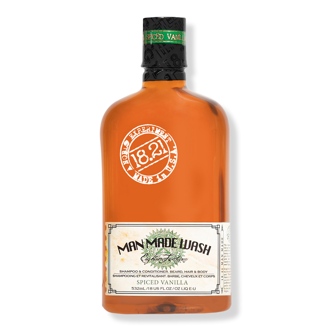 18.21 Man Made Spiced Vanilla Shampoo, Conditioner and Body Wash offers a moisturizing lather that cleanses, conditions and strengthens hair, beard, and body alike.