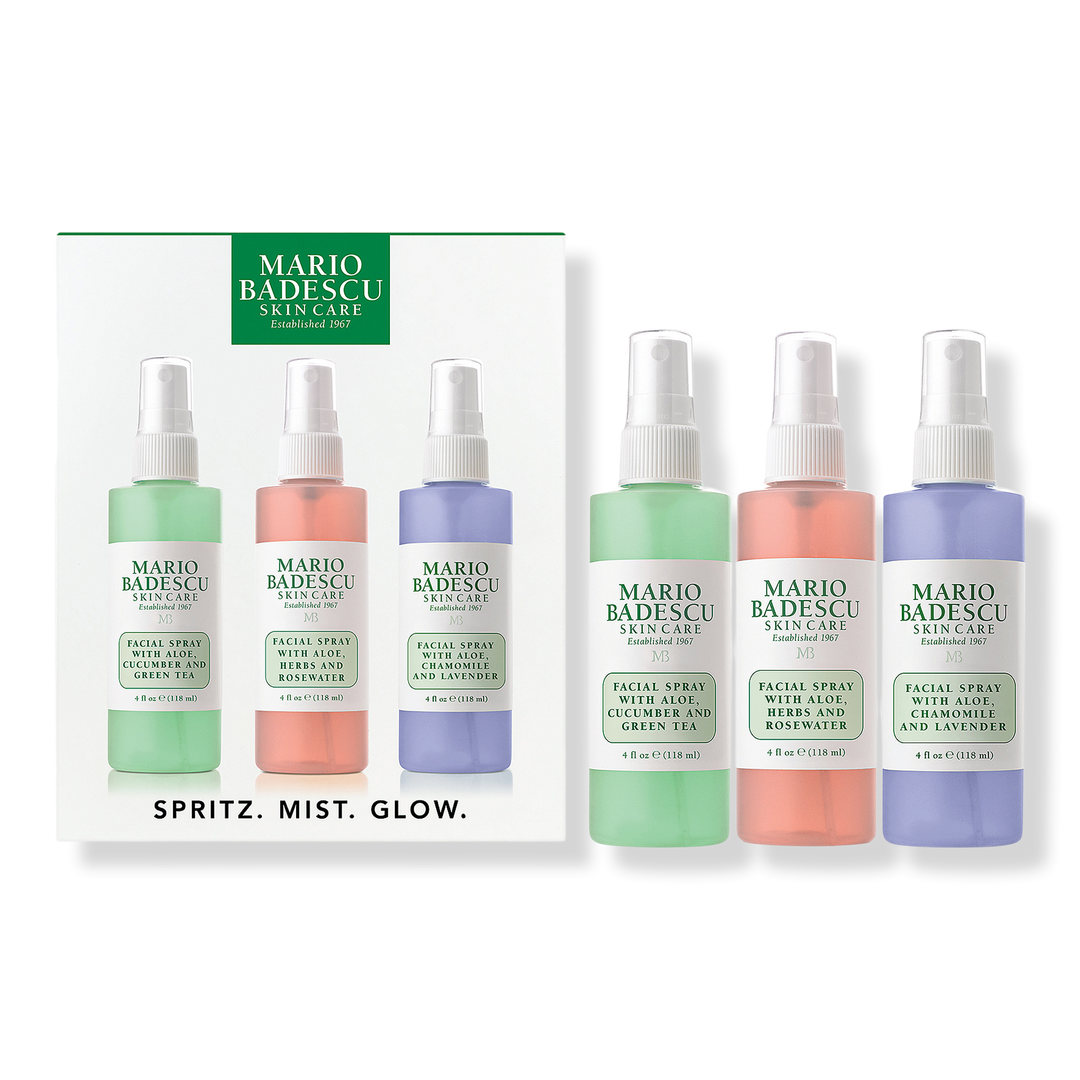 Mist like you mean it. Spritz. Mist. Glow. Set includes Mario Badescu's three facial sprays that can easily be incorporated into your day-to-night regimen.