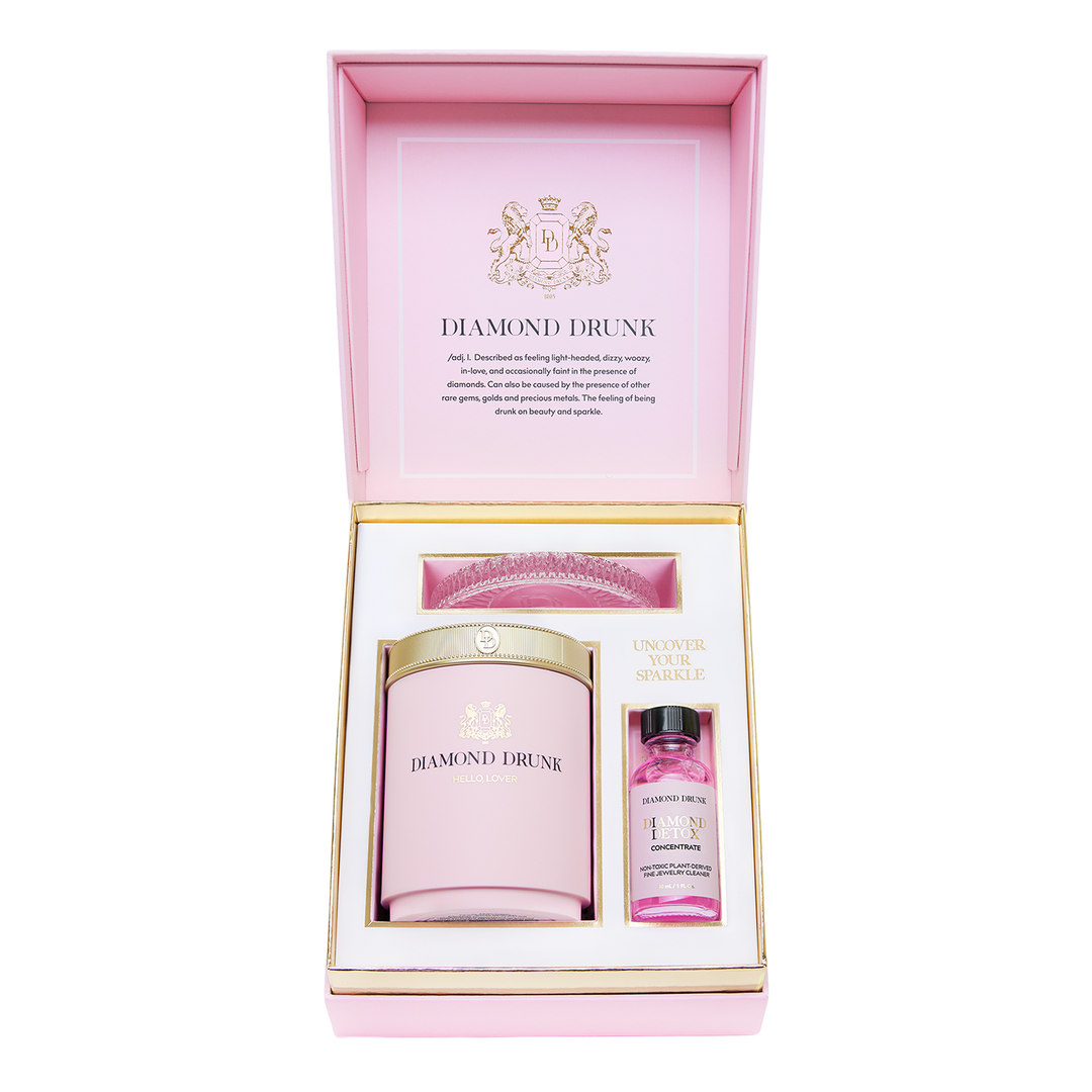 Non-toxic fine jewelry cleaner for diamonds, gold, and platinum. Includes a reusable Simply White vessel, Diamond Detox concentrate in Lemon Drop No. 22, patented bauble basket, crystalline coaster, and brush.