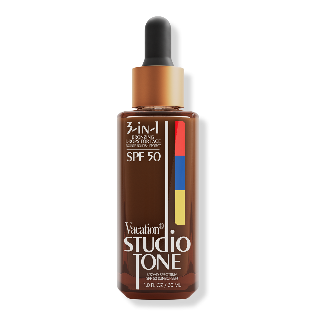 Vacation Studio Tone SPF 50 Bronzing Drops are the makeup artist’s secret to sunkissed skin. This 3-in-1 formula provides a natural, bronzed glow while offering nourishment & protection. Enjoy alone or under makeup for a boost of color alongside a skin barrier-strengthening cocktail of ingredients.