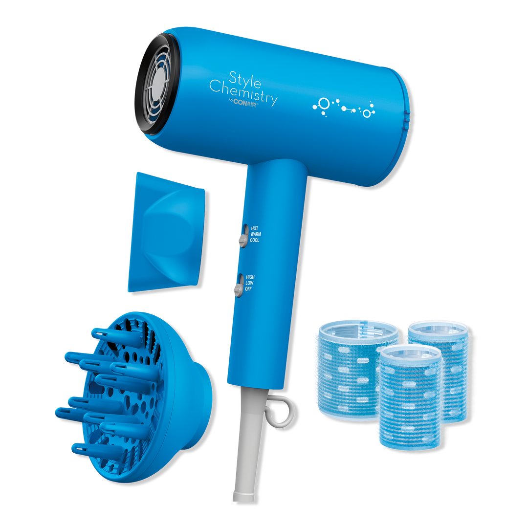 Style Chemistry by Conair Bouncy Blowout Hair Dryer adds volume and bounce with 3 Thermal Ceramic Self-Grip Rollers, 1875 watts of power, titanium ceramic tech, and ionic conditioning for smooth, full-bodied results with less frizz.