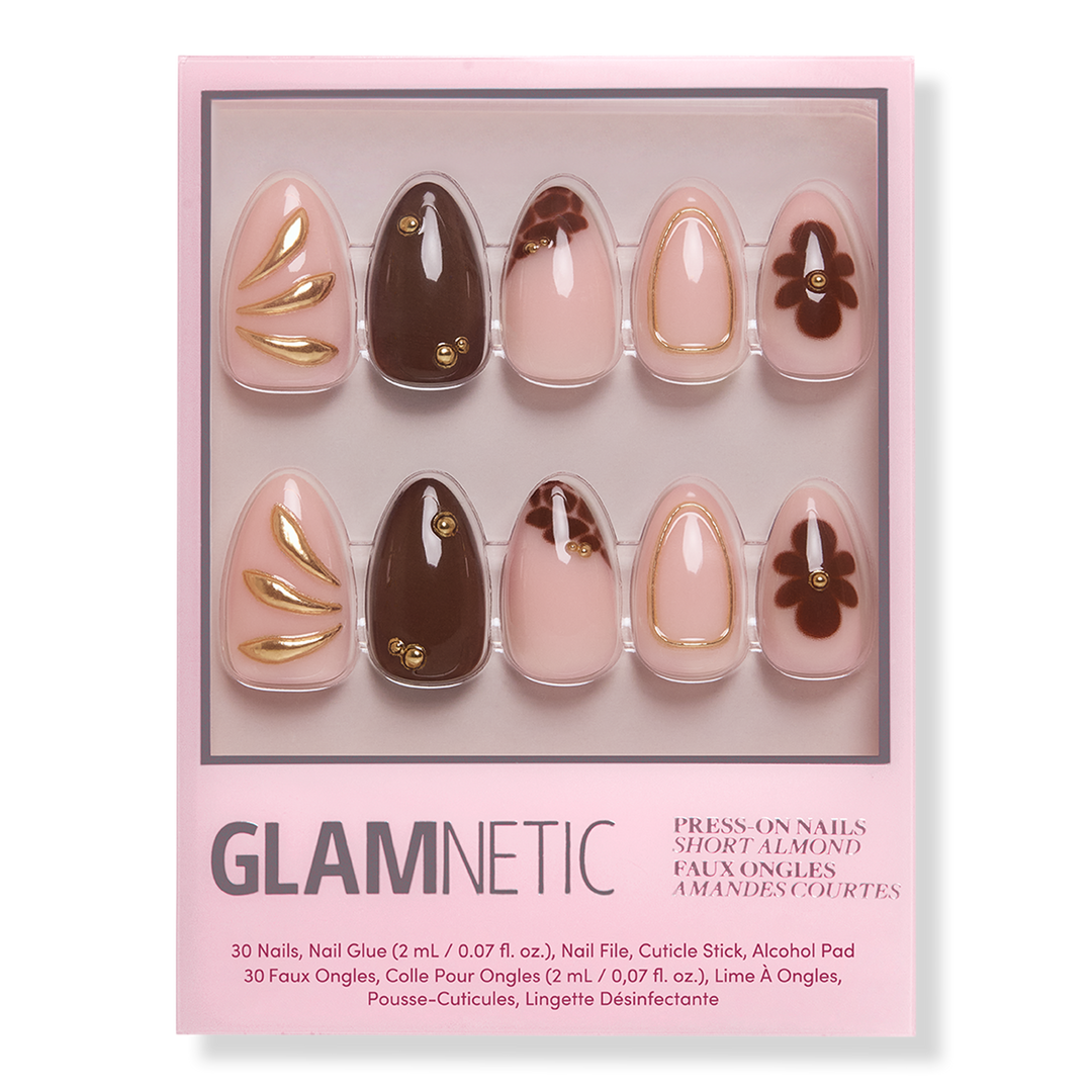 Where summer lingers longest. Glamnetic's Sunbaked Press-On Nail Set captures the warmth of terracotta afternoons with a mix-and-match short almond set. Find tropical brown florals, raised gold foil accents, and rich brown shades. Easy to apply in 10 minutes, this is a 2-week salon-quality escape.