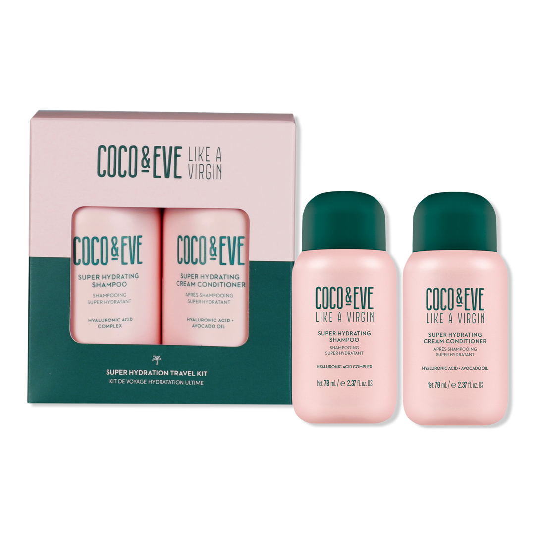 Achieve soft, shiny, and frizz-free hair with Coco & Eve's Super Hydration Travel Kit with sulfate-free Super Hydrating Shampoo & Conditioner in travel size. Infused with Bali botanicals and ResistHyal for 26x more hydration, strength, and smoothness. Perfect for normal to dry hair.