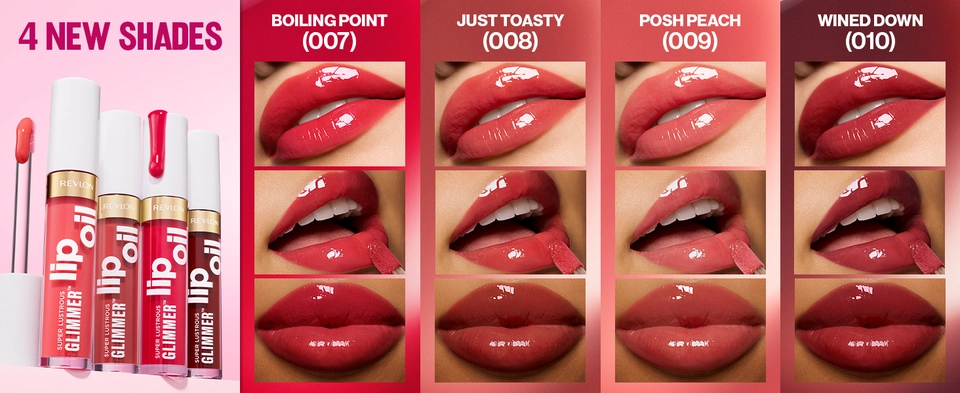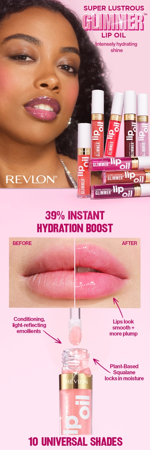 Revlon Super Lustrous Glimmer Lip Oil instantly boosts hydration for healthy-looking, juicy lips. Luxe, cushiony, non-sticky feel.