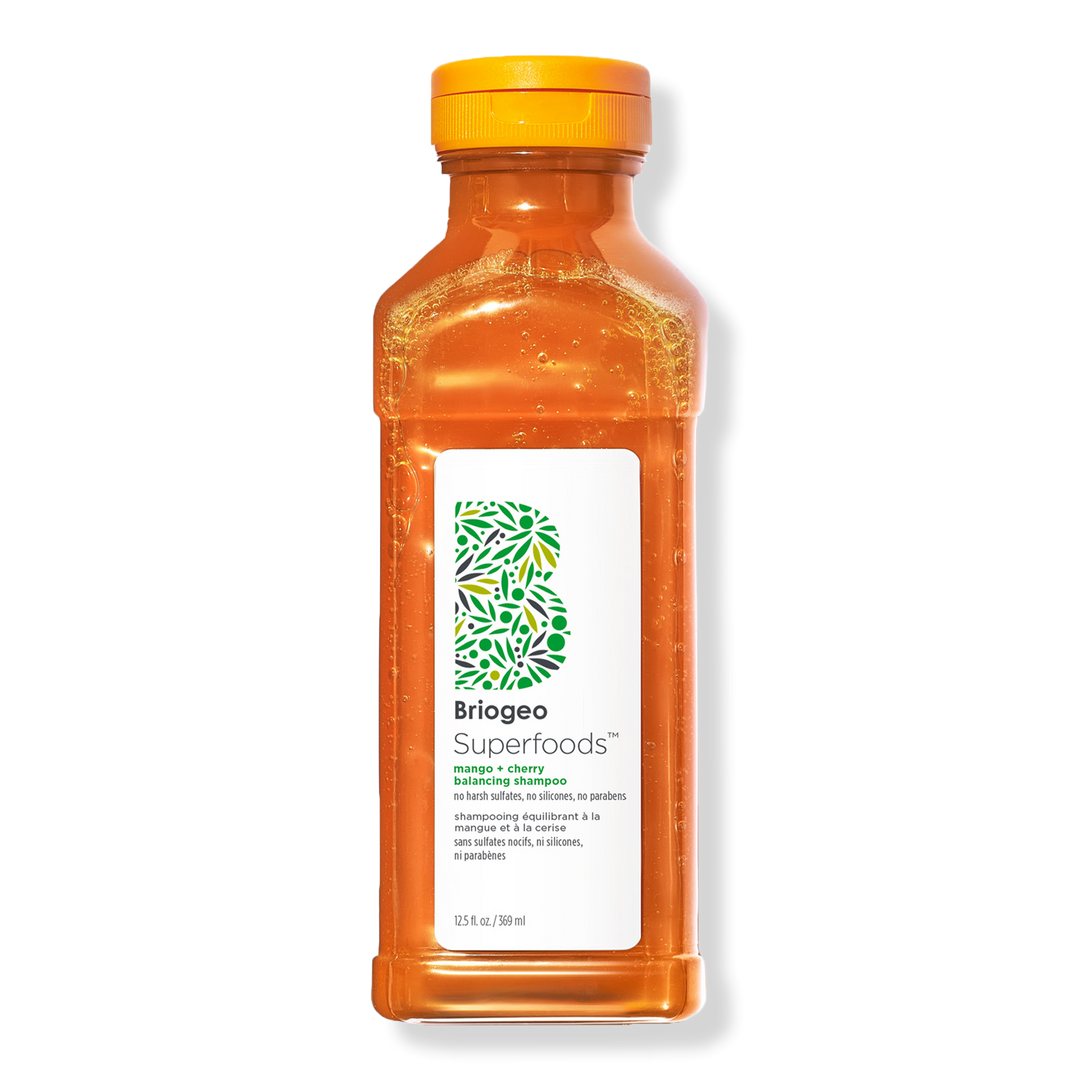 Briogeo's Superfoods Mango + Cherry Oil Control & Balancing Shampoo is a nutrient-rich, juice-inspired shampoo packed with vitamins and minerals to support healthy hair and scalp and a unique papaya enzyme known to help balance oil production.