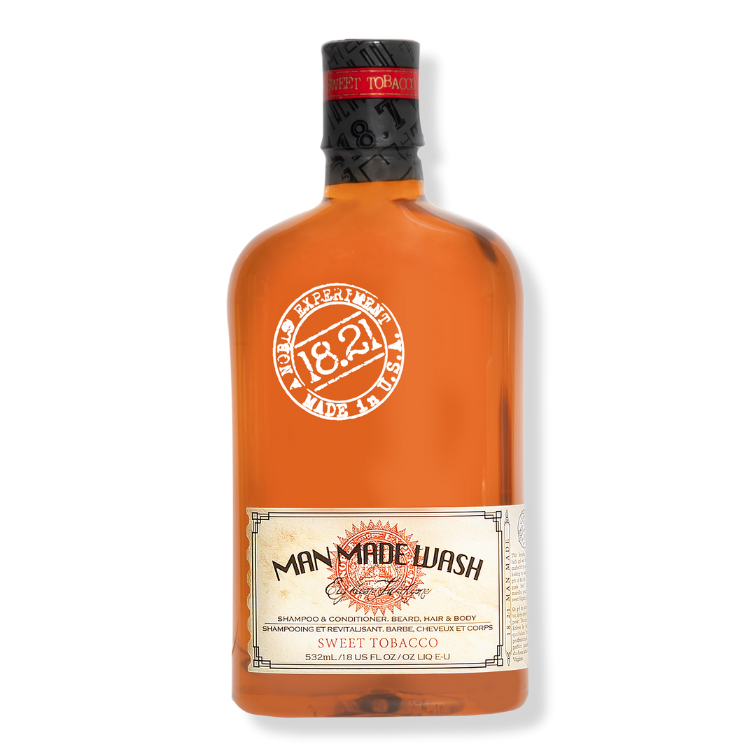 18.21 Man Made Sweet Tobacco Shampoo, Conditioner and Body Wash offers a moisturizing lather that cleanses, conditions and strengthens hair, beard, and body alike.