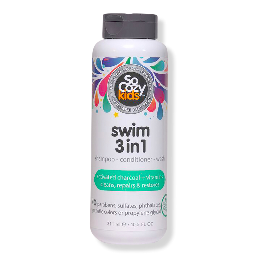 SoCozy Swim 3 in 1 shampoo + conditioner + body wash is a Salon formula that cleanses with activated charcoal and repairs damaged hair.