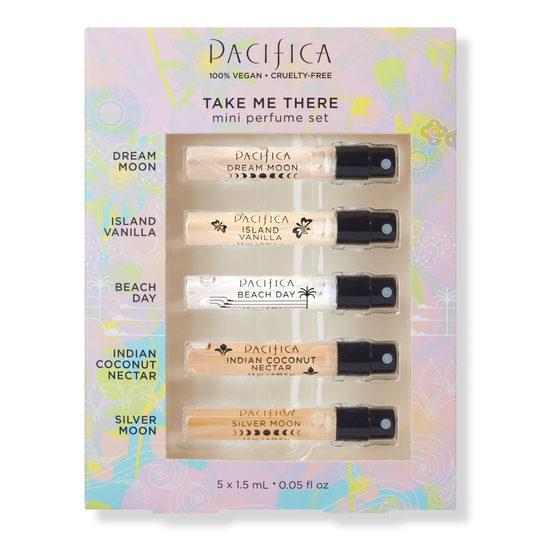 Scent has the ability to take you anywhere. Pacifica's Take Me There Min Perfume Set includes 5 travel-friendly fragrances in Dream Moon, Silver Moon, Indian Coconut Nectar, Island Vanila, and Beach Day. Backed by neuroscience, their functional fragrances are key tools for your pursuit of wellbeing.