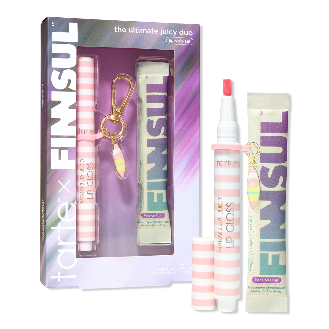Juicy lips, meet your daily sip. Lim-ed tarte x FINNSUL ultimate juicy duo with maracuja juicy gloss, FREE FINNSUL Electrolyte supplement & FREE charm!