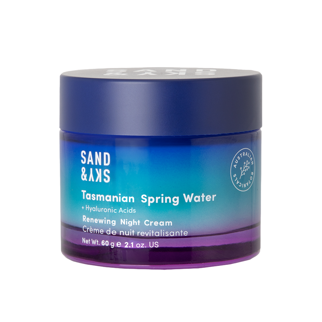 An overnight renewal cream with 3 types of Hyaluronic Acid and Glacial Glycoproteins that boost skin renewal by 56%. Vegan Squalane and Tasmanian Spring Water retain moisture by up to 30%, delivering a 110% increase in hydration and 24% reduction in wrinkles.