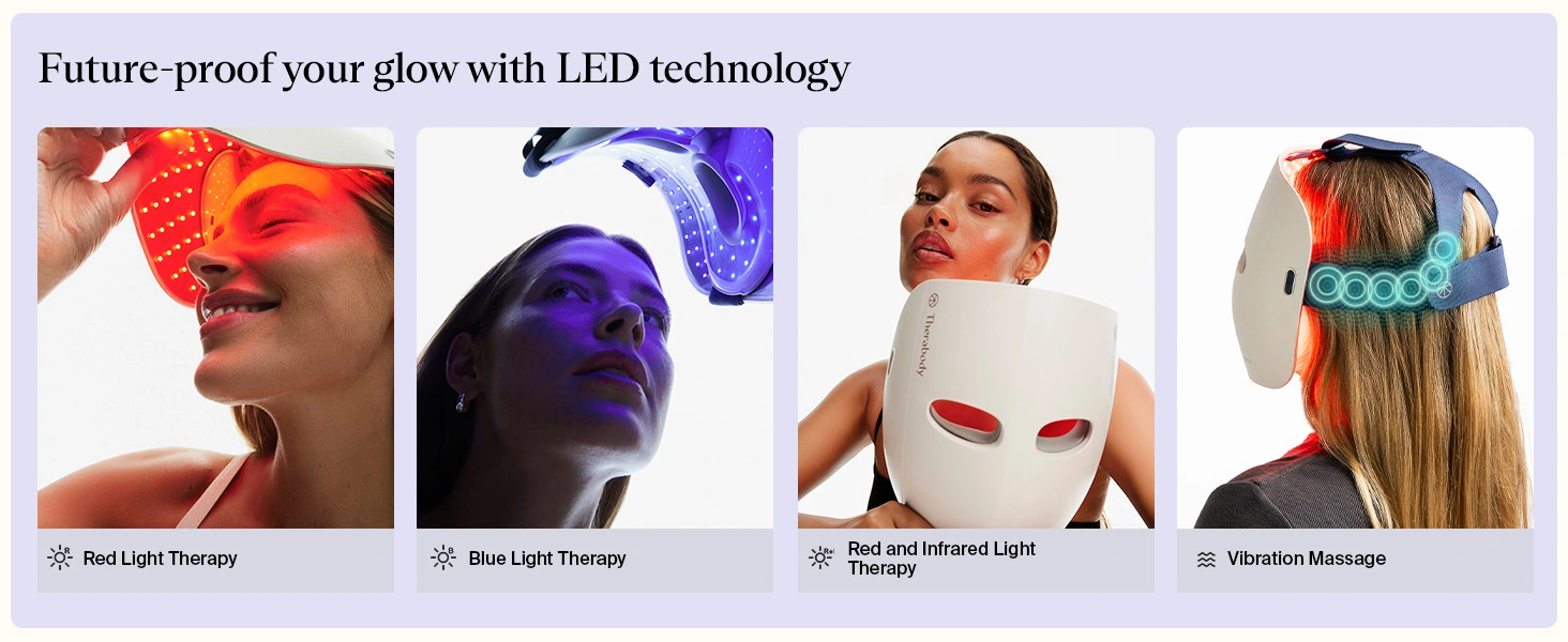 TheraFace Mask Glo is a dermatologist-approved, FDA-cleared LED mask that combines Red, Red + Infrared and Blue light with a relaxing scalp massage for glowing, healthier-looking skin.