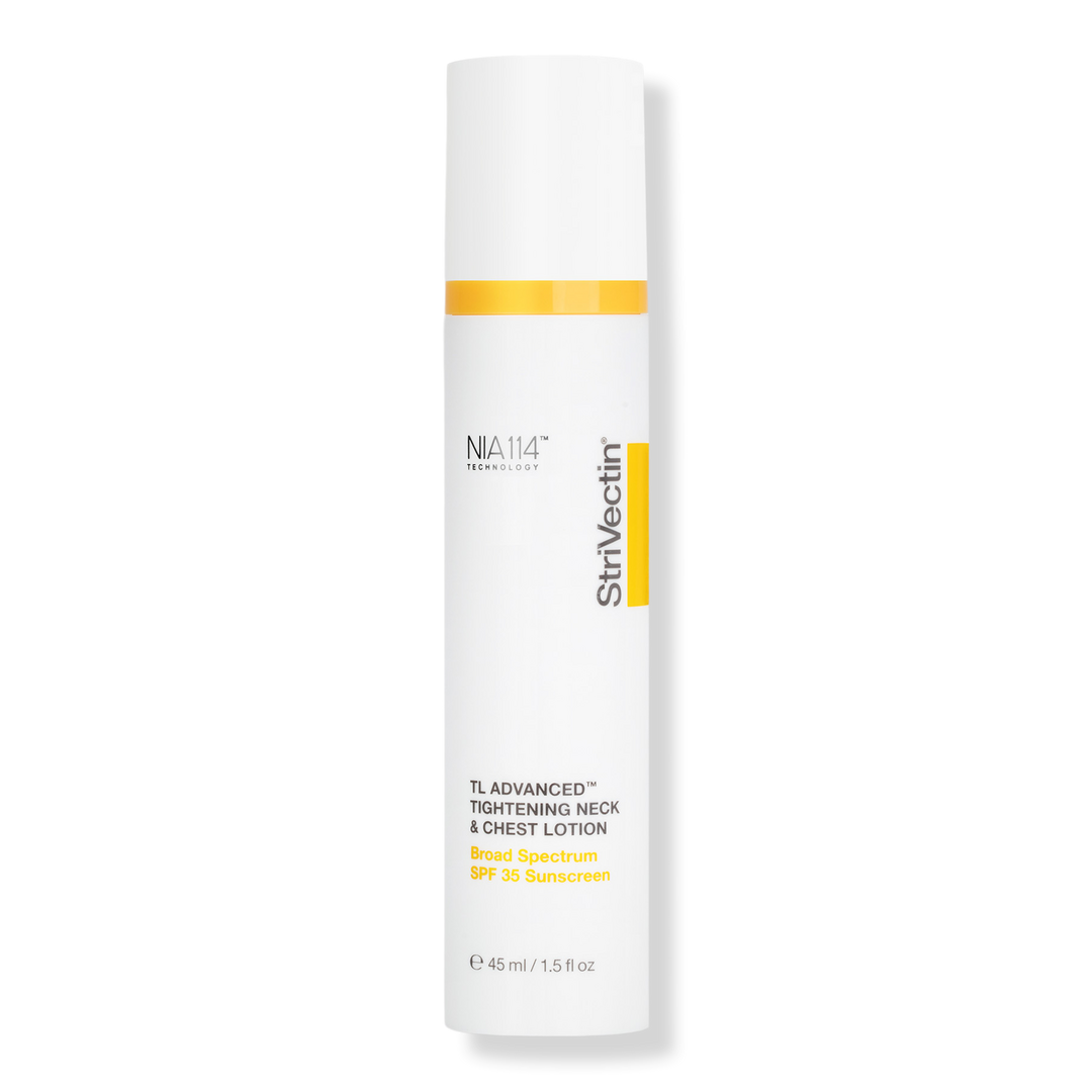 StriVectin’s TL Advanced® Tightening Neck and Chest Lotion Broad Spectrum SPF 35 Sunscreen visibly tightens sagging skin and restores radiance for a firmer, more even-toned neck and chest.