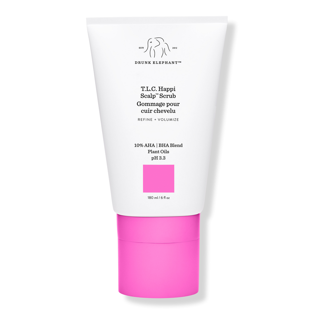 Drunk Elephant's T.L.C. Happi Scalp Scrub uses a supercharged 10% AHA/BHA blend to dissolve dead cells and styling product buildup while biodegradable plant-cellulose exfoliating beads sweep them away.