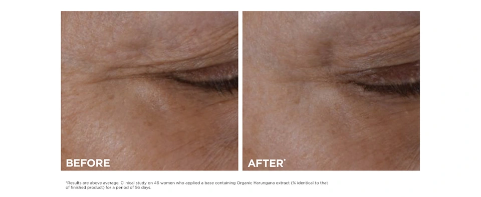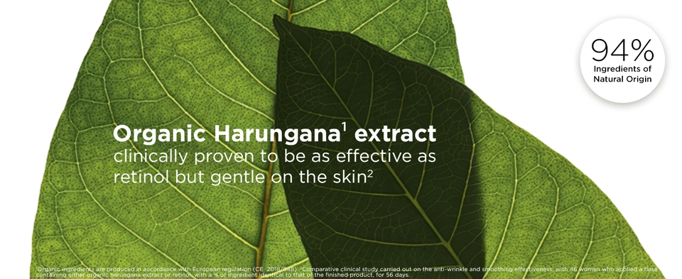 - Exclusive Organic Harungana* extract, nature's retinol, visibly firms + fights wrinkles and helps to smooth + replenish