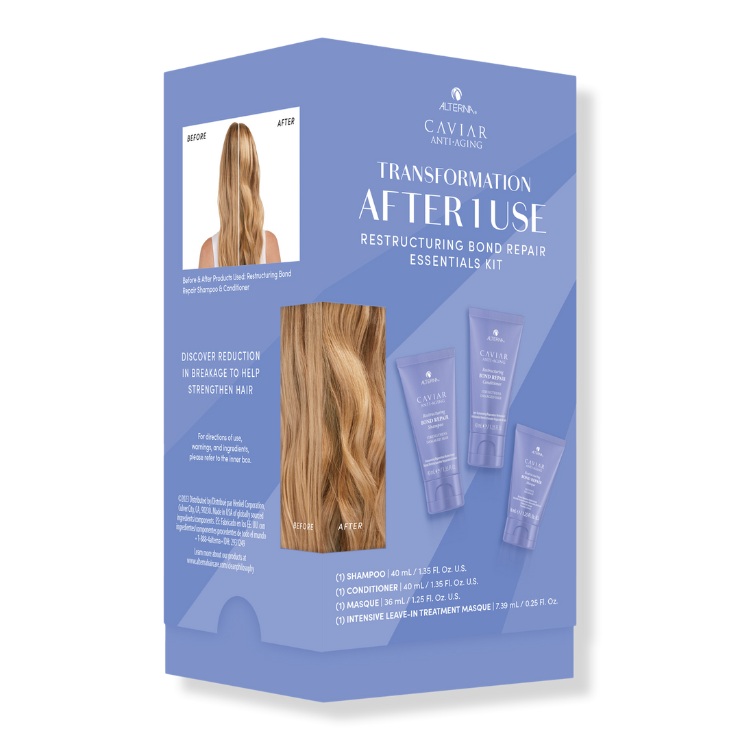 Alterna's Transformational Bond Repair Kit includes a reparative shampoo and conditioner duo that protects and repairs damaged hair, and a moisturizing, reparative treatment masque that reduces breakage and frizz.