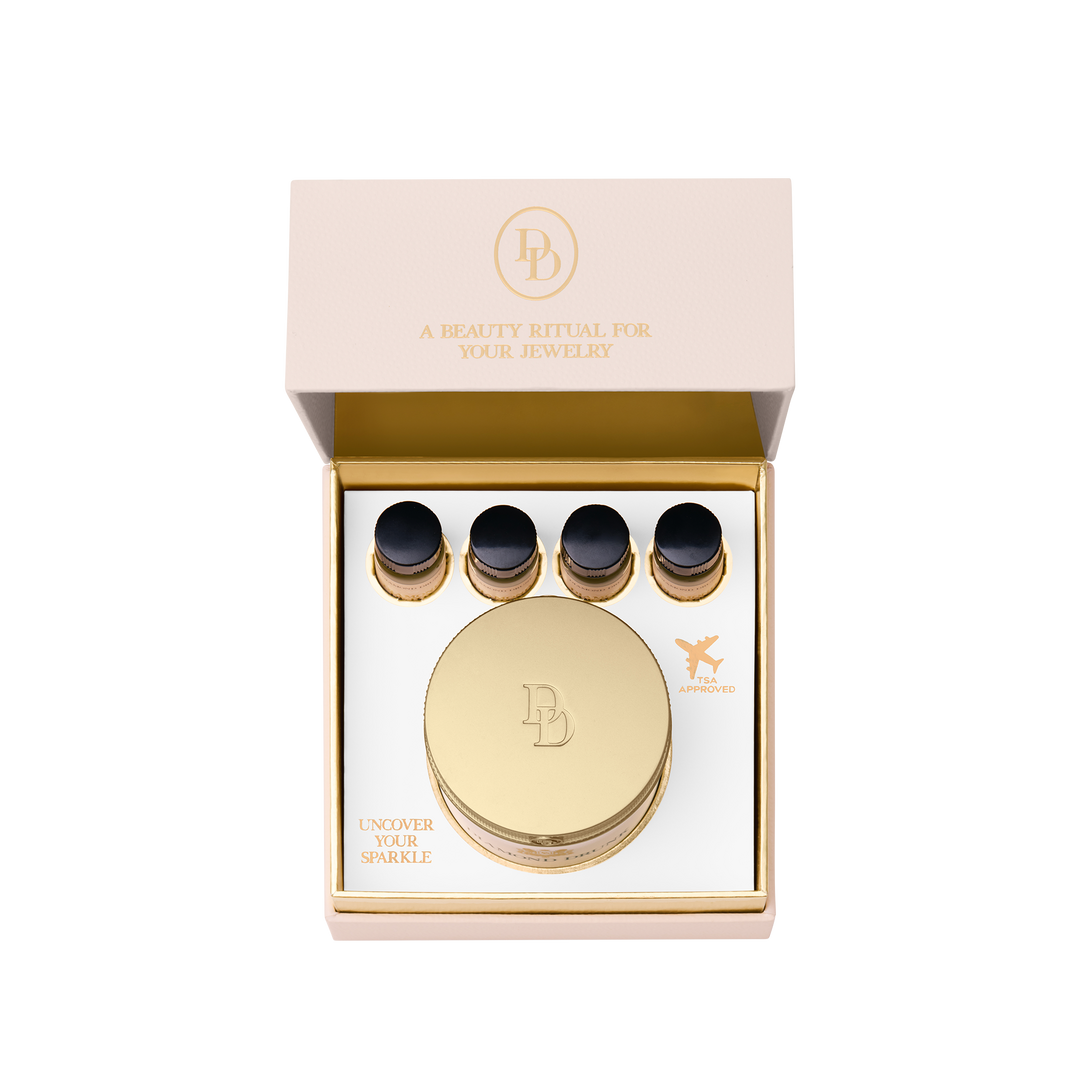 TSA-approved, leak-resistant travel-size fine jewelry cleaner for diamonds, gold, and platinum. Includes a reusable Beach Beige vessel, four Diamond Detox concentrate vials in Wellness Retreat No. 24, mini bauble basket, and brush.