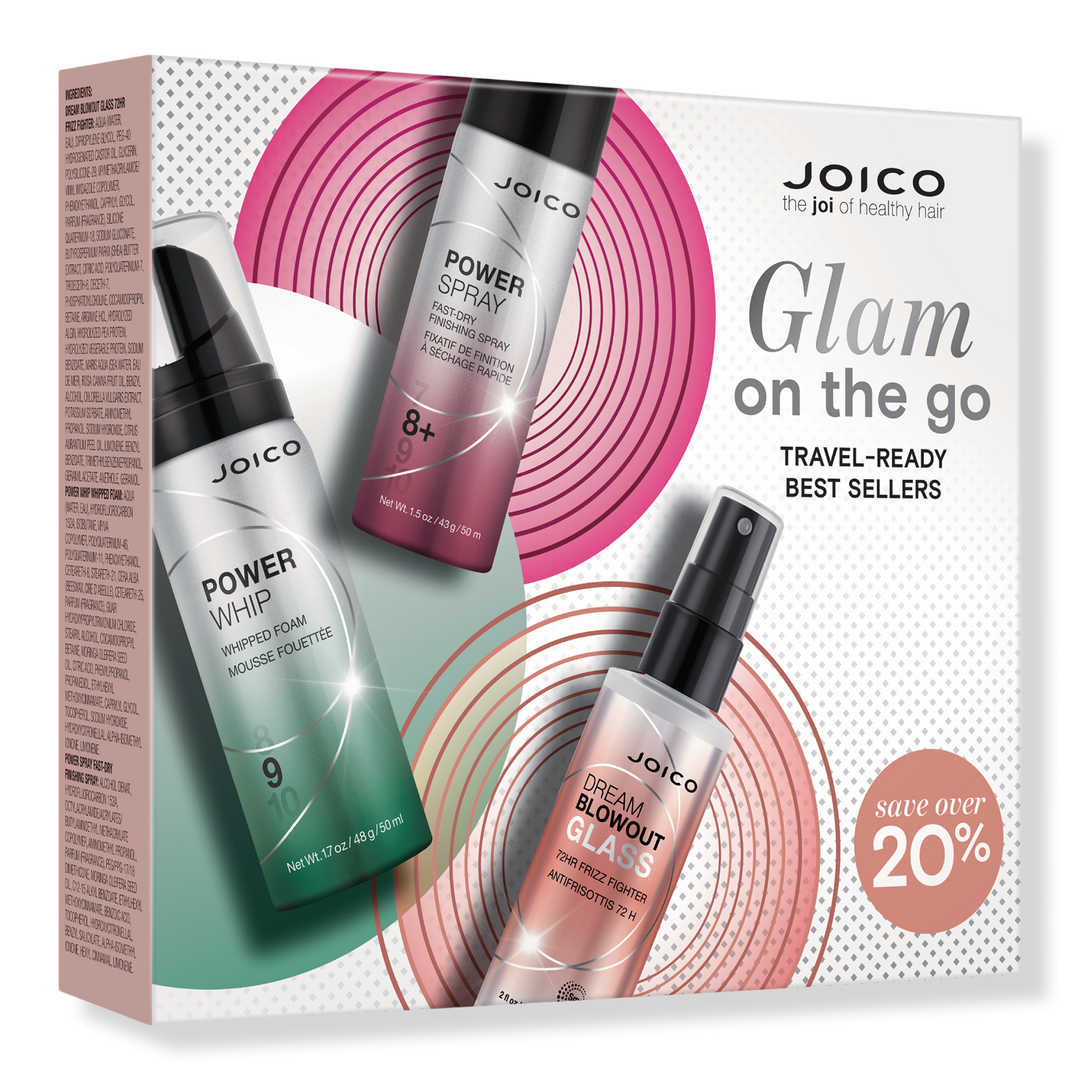 Meet your Style Travel Kit. Power Whip, a creamy styling foam that builds body. Dream Blowout Glass for 72-hour frizz control and glass-like shine. Lock it all in with Power Spray, a fine aerosol mist that delivers up to three days of humidity-resistant hold.